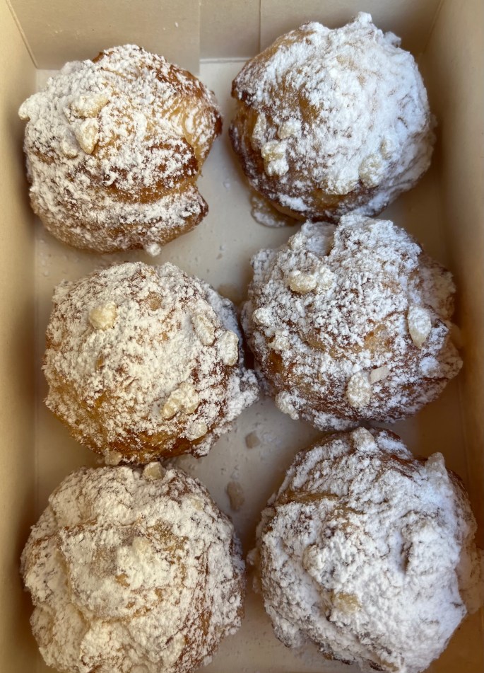 Little puffy clouds of goodness. Crispy dough topped with powdered sugar with the inside being a creamy gooey goodness. I was able to eat one of these – so light. Ha!