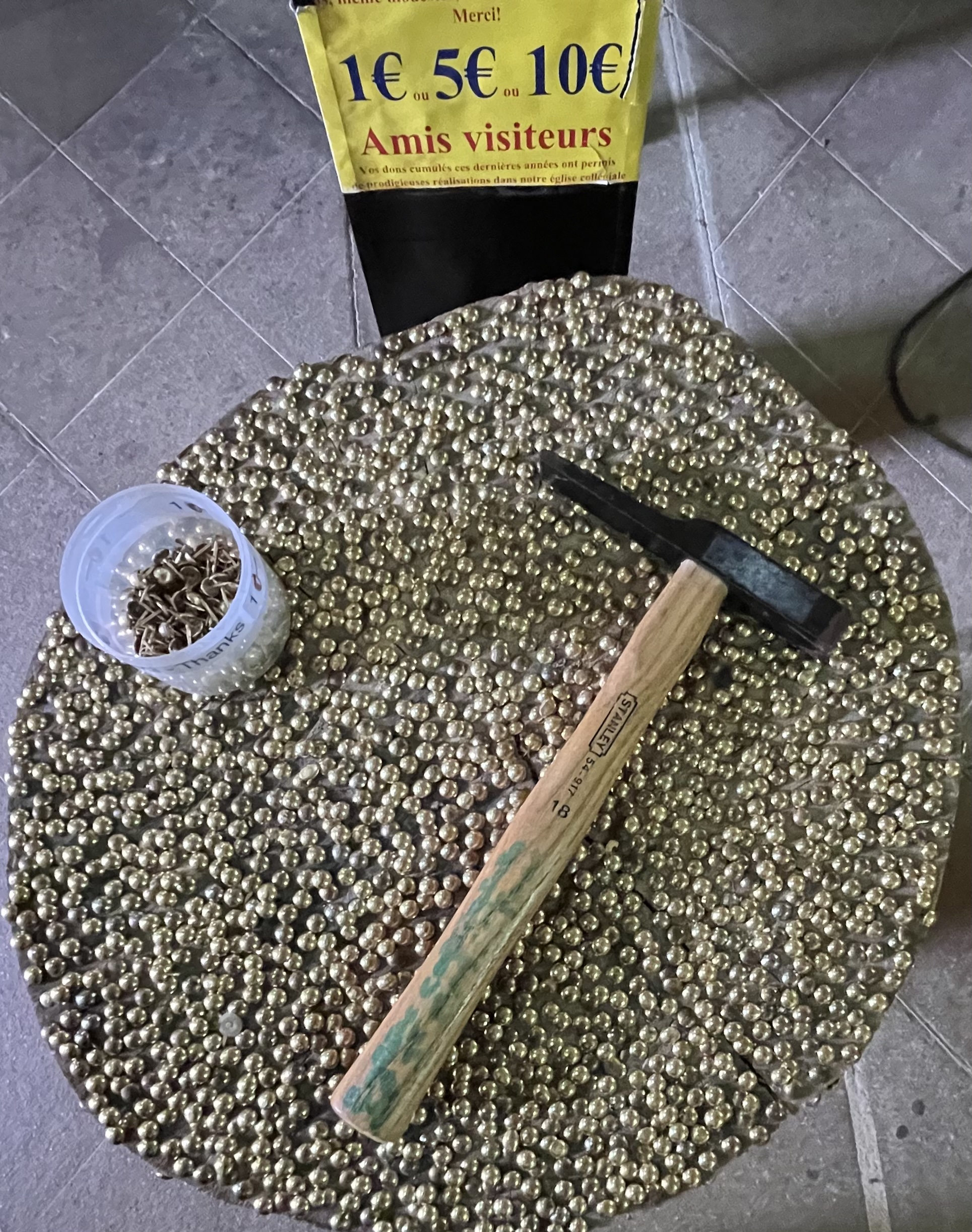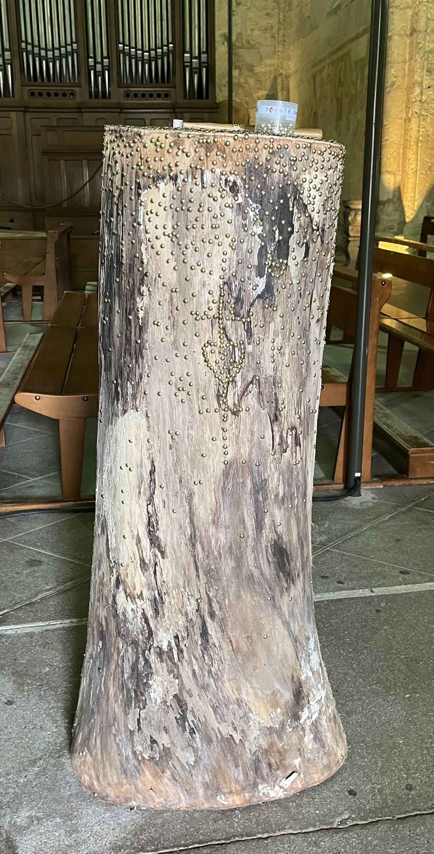 As with most churches, coins can be dropped and candles lit to honor and pray for others. While that was an option, there was also this – a local tree trunk and brass tacks. For 1 euro you could be part of the ‘masterpiece’. I left my mark on the side of the trunk.