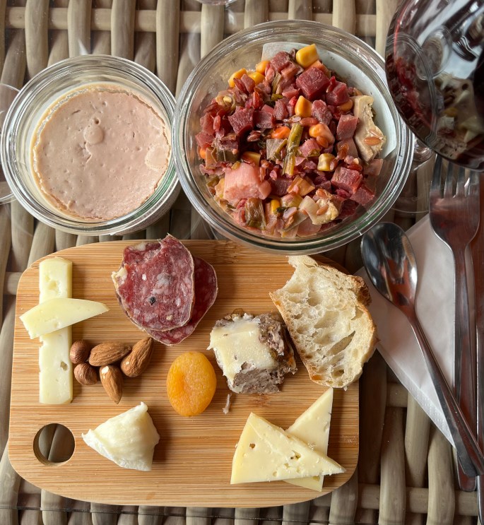 Besides the local cheeses and meats, we had a chicken & beet salad (right bowl) and cheesecake (left bowl) for dessert. Waaaaay to much food for me. Oh, and red wine to drink.