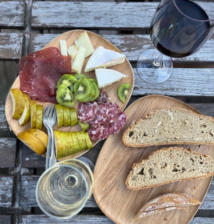 There were other nights much like this. I believe earlier I indicated we had an outside eating area with our apartment. This evening we had pears and kiwi with the meats and cheese.