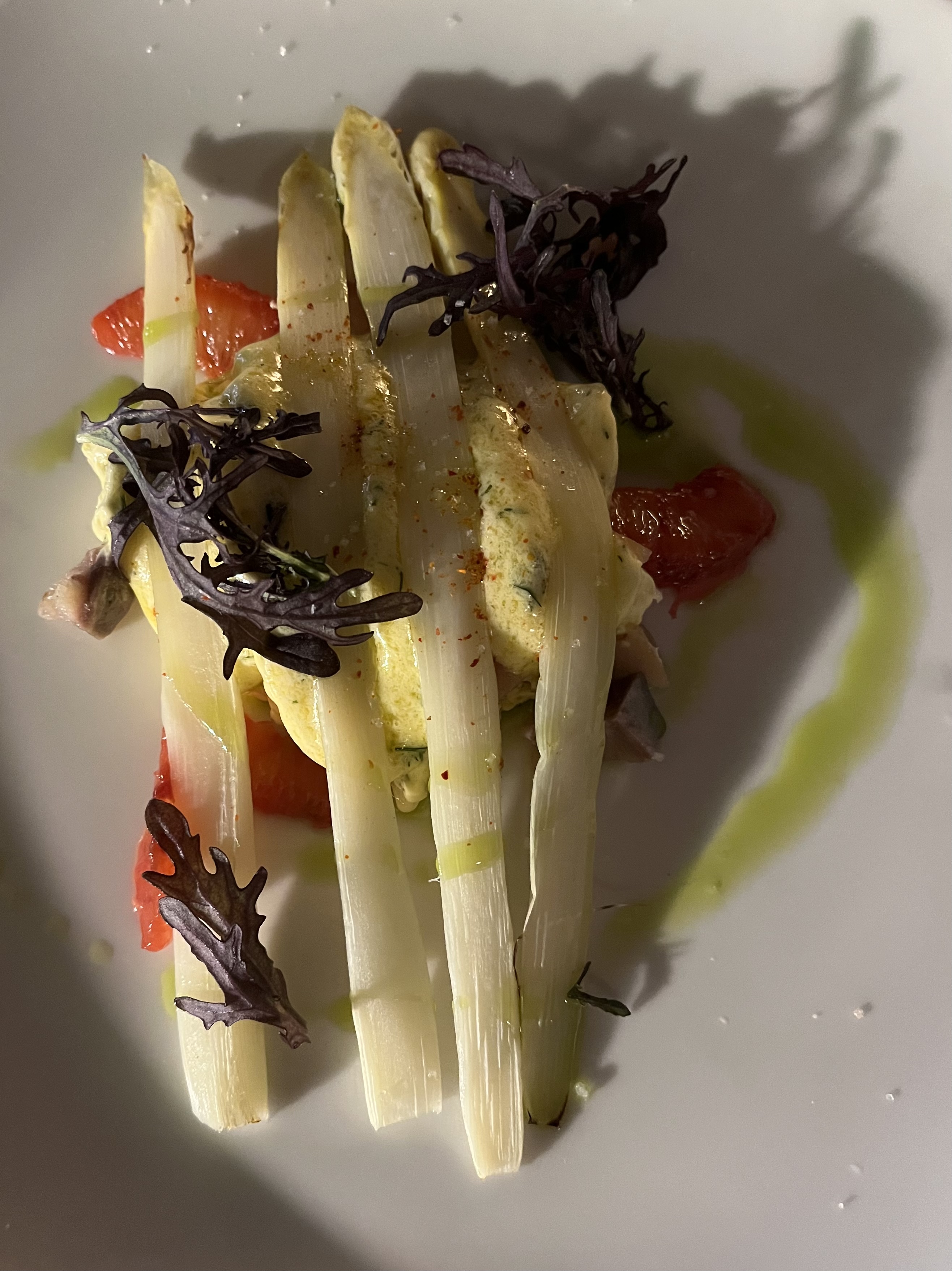Needless to say, we ordered different things in order to taste as much as we could. Eric had been waiting to try the white asparagus as it was in season and he got his wish, while Adrienne order the seafood capaccio as an appetizer. For our main courses, Eric selected beef and Adrienne ordered the piche du jour (seafood). My chosen dish was the pintade (chicken). We each were very happy with our selections.
