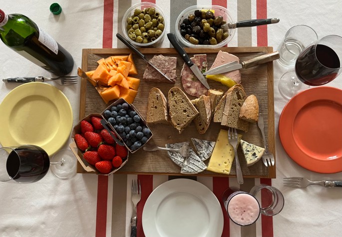 This was our end result that evening. Add in some (absolutely delicious) fruit, briny olives and french bread and it was feast. Oh, and red wine for them and rouge beer for myself.