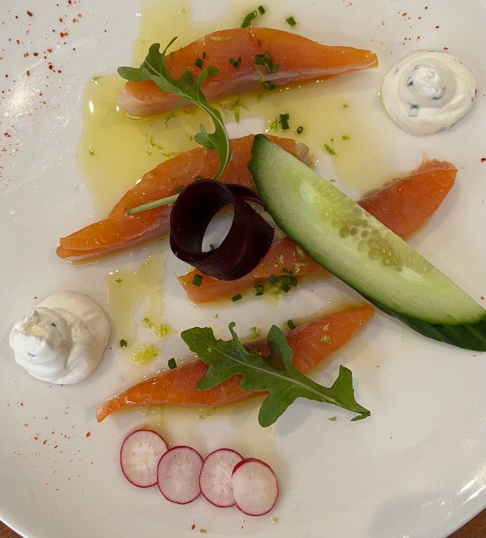 We got the most awesome starter: smoked trout from St Etienne de Baigorry with lemon cream. It was fantastic. We could have all licked the plate. We were even fighting over the tiny radishes.
