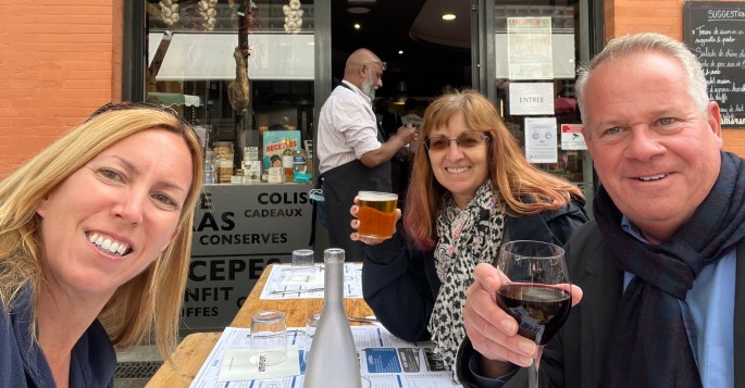 We got a quick shot before food started arriving. Our waiter was in the background. He was a real character. Those two had red wine and I was ready for beer. When the waiter thought my beer was too warm (drinking it too slowly), he swapped out my glass for a colder beer. Really? Really!