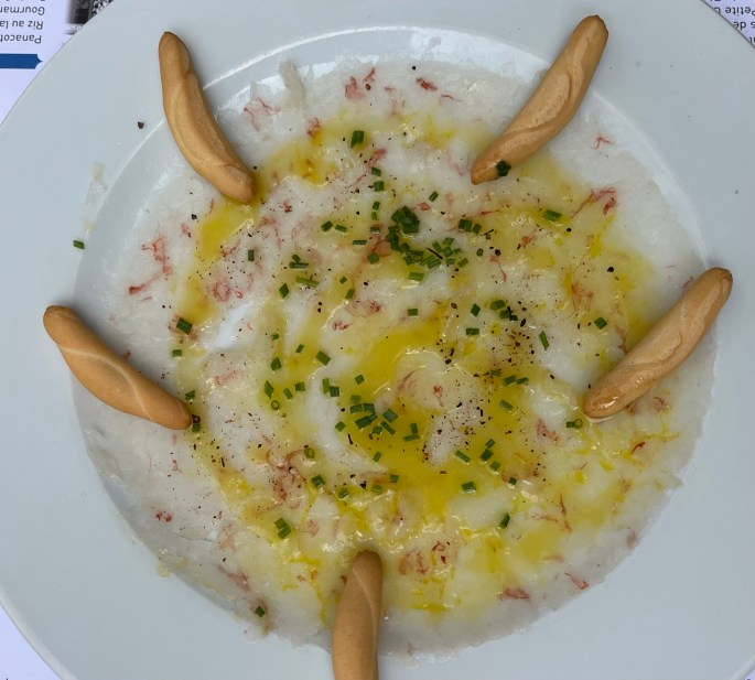 Almost forgot, we had a starter – shrimp carpaccio. OMG once again. Didn’t look like much since the shrimp were sliced so thin, but we all contemplated licking the plate. Those little round-ish things – crackers.
