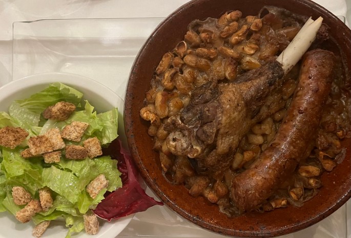 So what exactly is Le Cassoulet? It is a rich, slow-cooked casserole containing meat, pork skin and white beans that originated in southern France. It is named after the traditional cooking vessel – a deep, round, earthenware pot with slanting sides. Our particular cassoulet recipe contained Toulouse pork sausage, goose confit and pork skin. There are regional differences, usually involving the meats that are included.