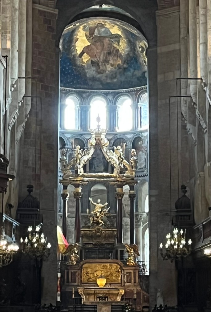 We entered the basilica through the doorway in the background of the above photo. The relief above that doorway celebrates the ascension of Christ in the midst of angels.