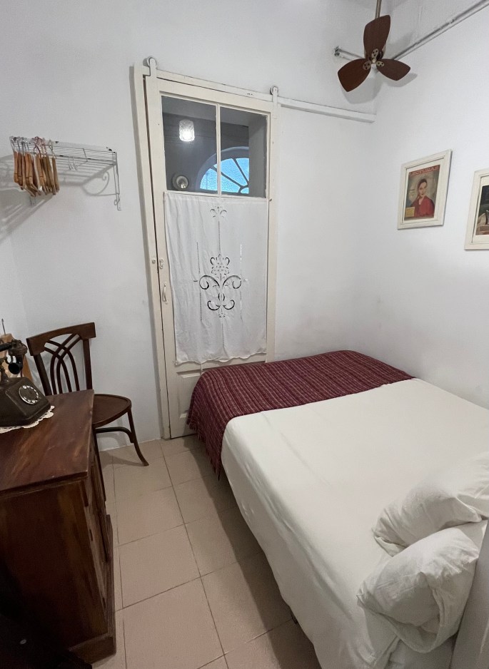 The third but un-used bedroom is seen below. The bedrooms were pretty much in line with each other. This place was skinny but had depth as you will soon see. In the photo below a fan is seen in the corner. Each of the bedrooms had one. If put on high……….felt and sounded like a tornado! Thanks, hon for waking me up. At night. After I was settled in.