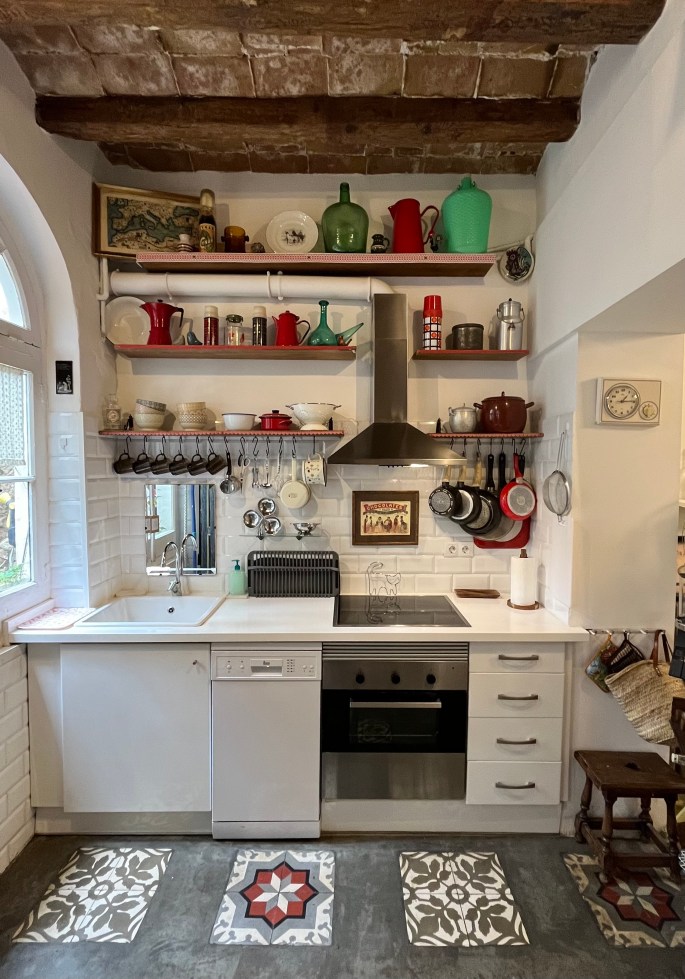 Towards the back of the apartment was the kitchen. Again, small, tidy, stove top & oven along with a small dishwasher. What looks like mats on the floor are tiles incorporated in the concrete flooring.