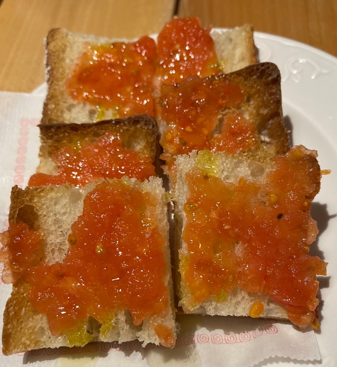 What else did we order? We were introduced to tomato bread. Simple yet oh so satisfying. Crusty bread, grated tomato with a splash of olive oil and sprinkle of sea salt. OMG.