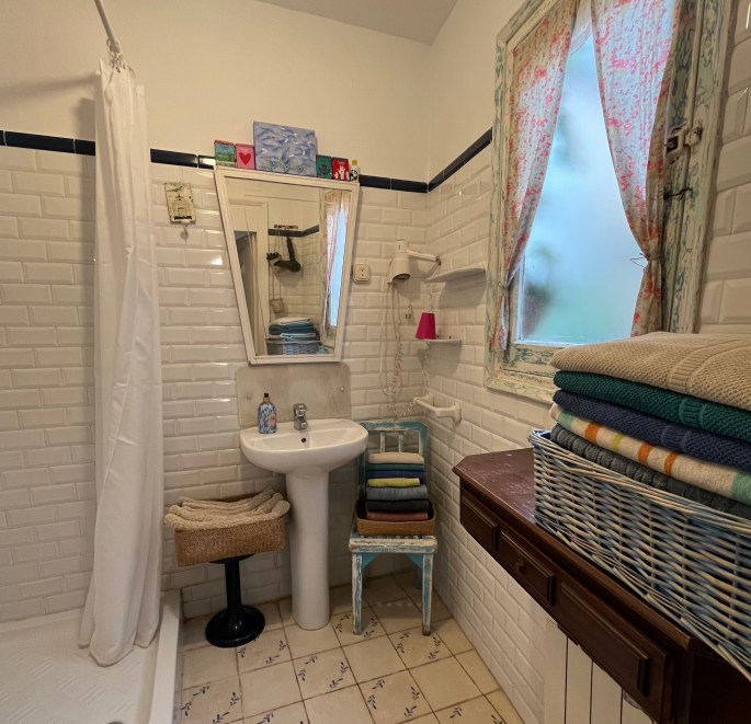 The powder room was also tight and the only time we shared one space during our trip. Compact corner shower was a continual fight with the shower curtain! No matter how much you tried, water escaped confinement.