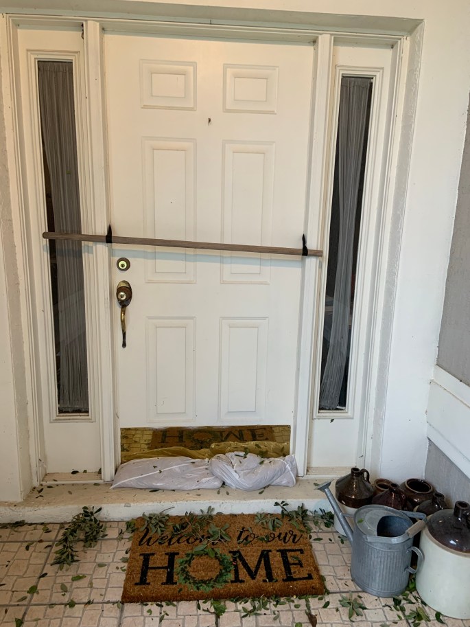 We had a few chores around the house to get things ready like pulling in lawn chairs, placing potted plants next to the house and laying down anything that could go flying. Eric thought we might have two weak spots. One was the front door; this was his solution.