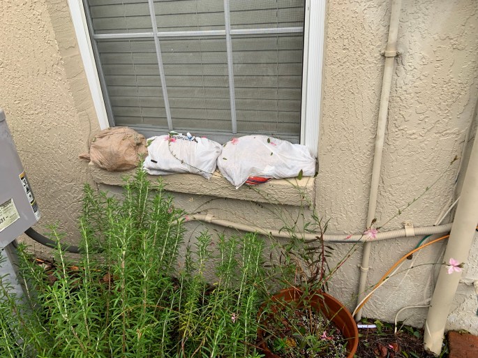 Notice the sandbags at the bottom? He decided (late) that a few sandbags were needed and we had to make our own. East-facing windows were our second weak spot with the direction of the driving rain being the main factor. Here’s one of them. Not very pretty, but effective.
