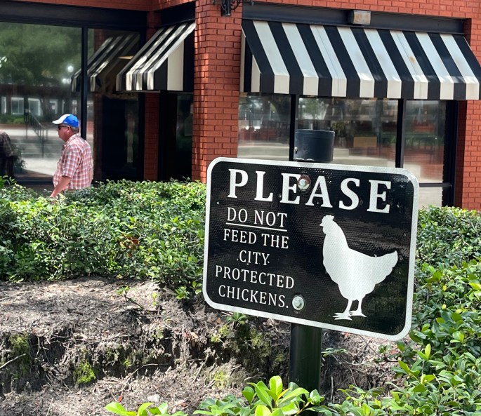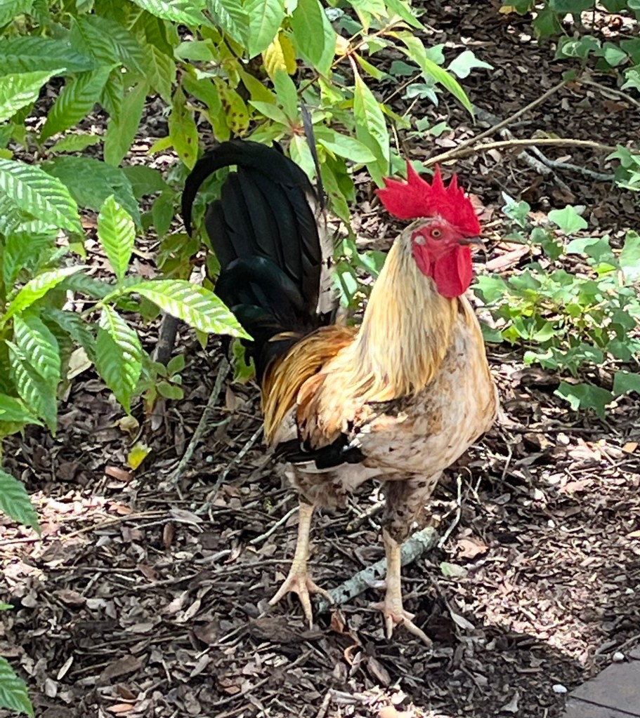 They are wild, direct descendants of chickens that lived in nearby backyards over 100 years ago. Penalties are levied if caught disturbing them. Yep, Eric is in the background – photo bombing my shot.