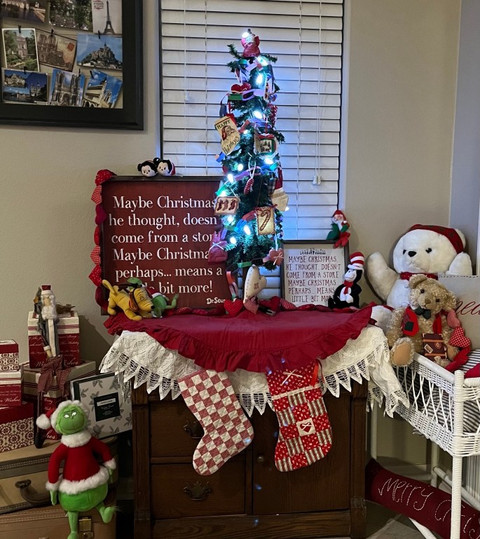 This year a Christmas tree almost didn’t happen, so I modified my expectations and decorated my primitive tree creating a holiday focus point. Yep, the Grinch is featured along with my collection of holiday plush. Most of the ornaments on the tree were home-made through the years by grandma and myself. Harder to see was a paper chain garland created by the godsons in 2006. It’s packed away carefully each year and brought out the following year.