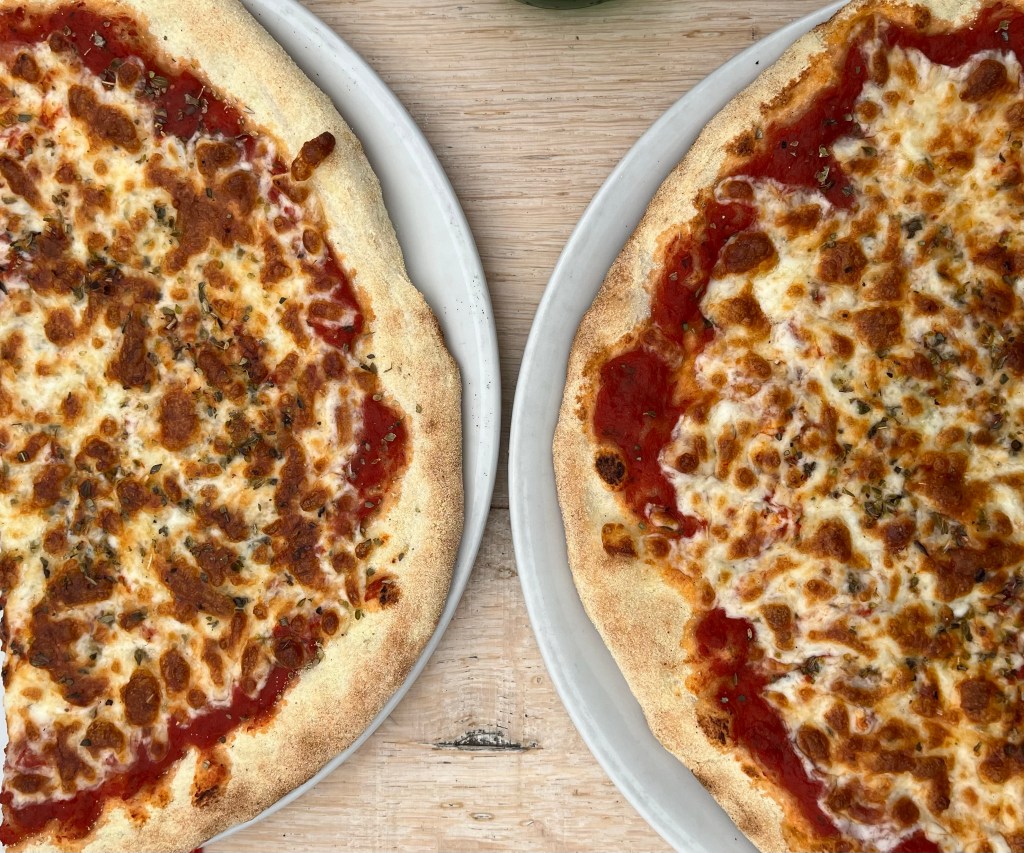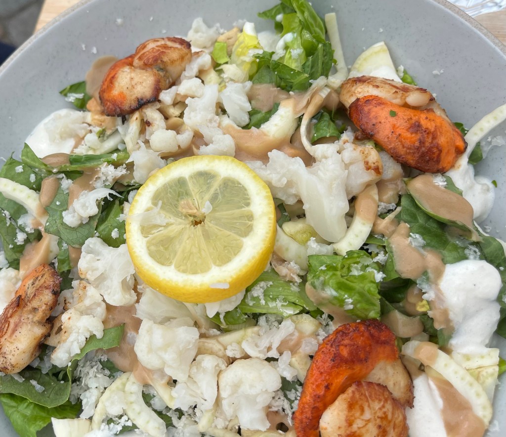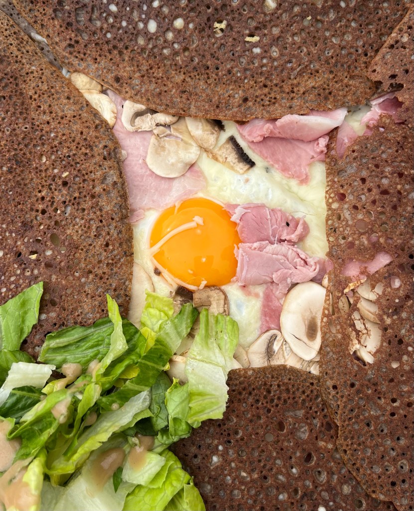 Seafood salad, a savory galette and pizza (shared) were our selections. You’ll have to guess who ordered what. 🙂
