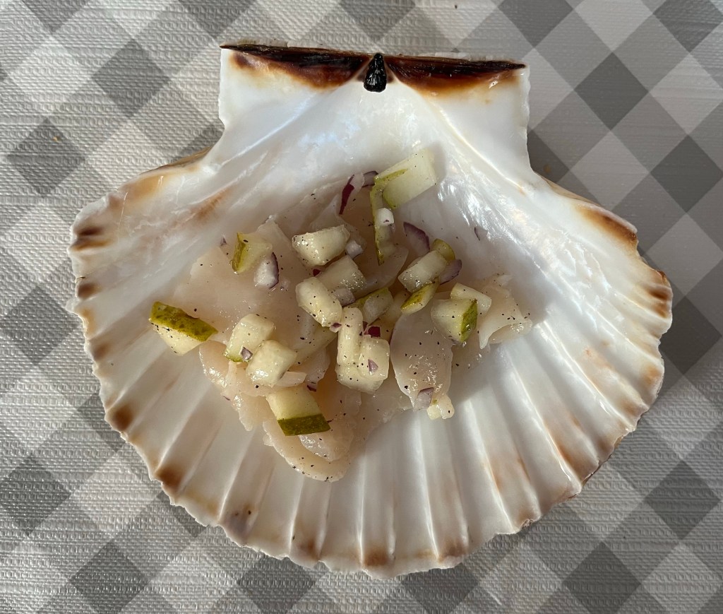 Other fresh seafood meals were created in-house, literally, in our house. Eric walked to the seafood market half a block away and picked up oysters and scallops, prepped with lemon juice, shallots and pears – excellent. Not a recipe he had prepared before, but sometimes those are the best kind. He pulled together what we could find at the grocery store nearby. I can tell you the scallops were a definite hit.