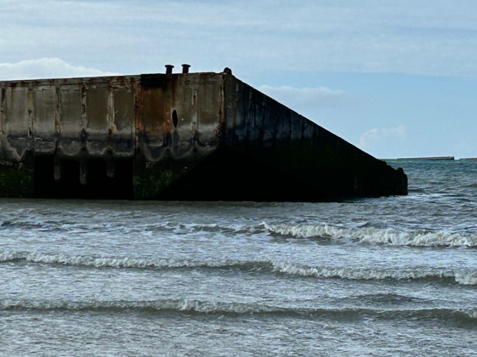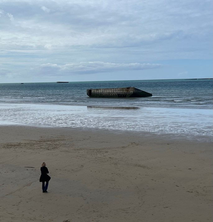 Above, Adrienne is walking to one of the remaining ‘Mulberrys’. Gold Beach was to be one of the Mulberry Harbors that was brought across the Channel on D+1 to facilitate rapid off-loading of cargo onto the beaches after the Allied invasion. The other two figures below are Connor and Eric. An entire post could be dedicated just to the creation, building and execution of the Mulberry harbor.
