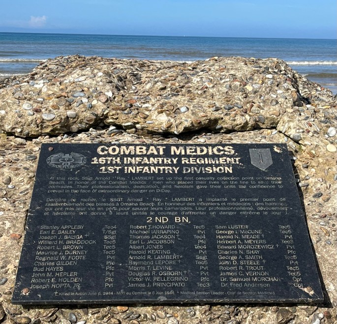 Causalities were most severe among the troops landing at either end of Omaha. Most companies were at best disorganized, leaderless and pinned down with no hope of carrying out their assault missions. This monument was created to recognize the bravery of the medics as they dodged bullets running to injured soldiers along the beachfront – having no way to protect themselves.