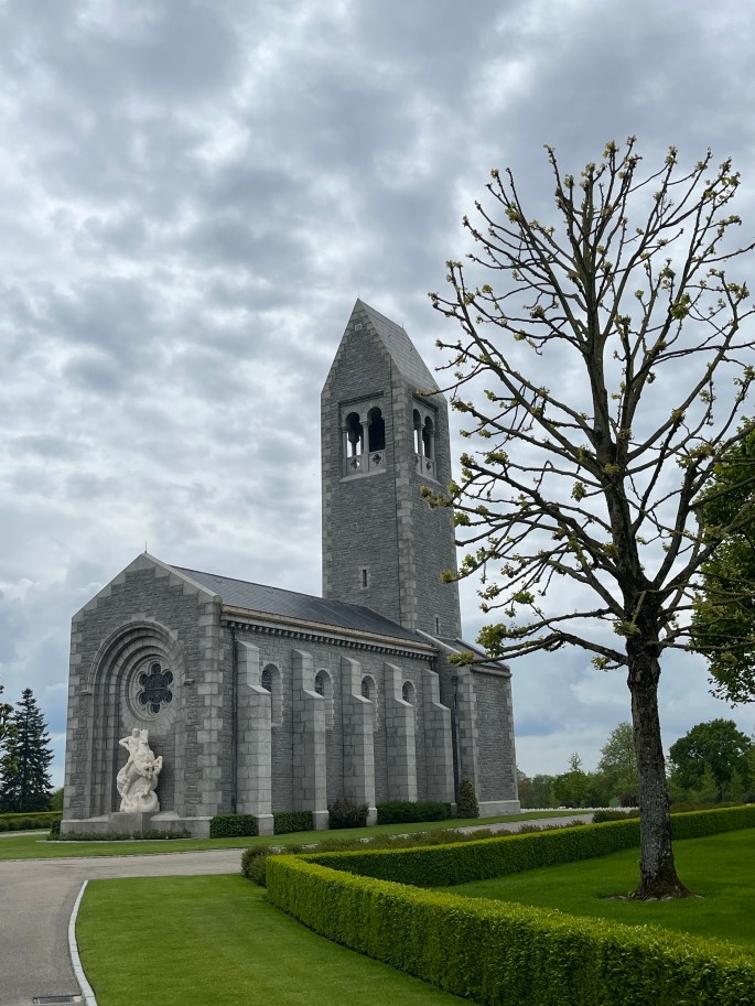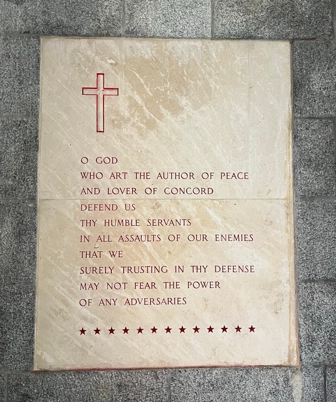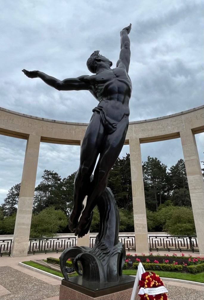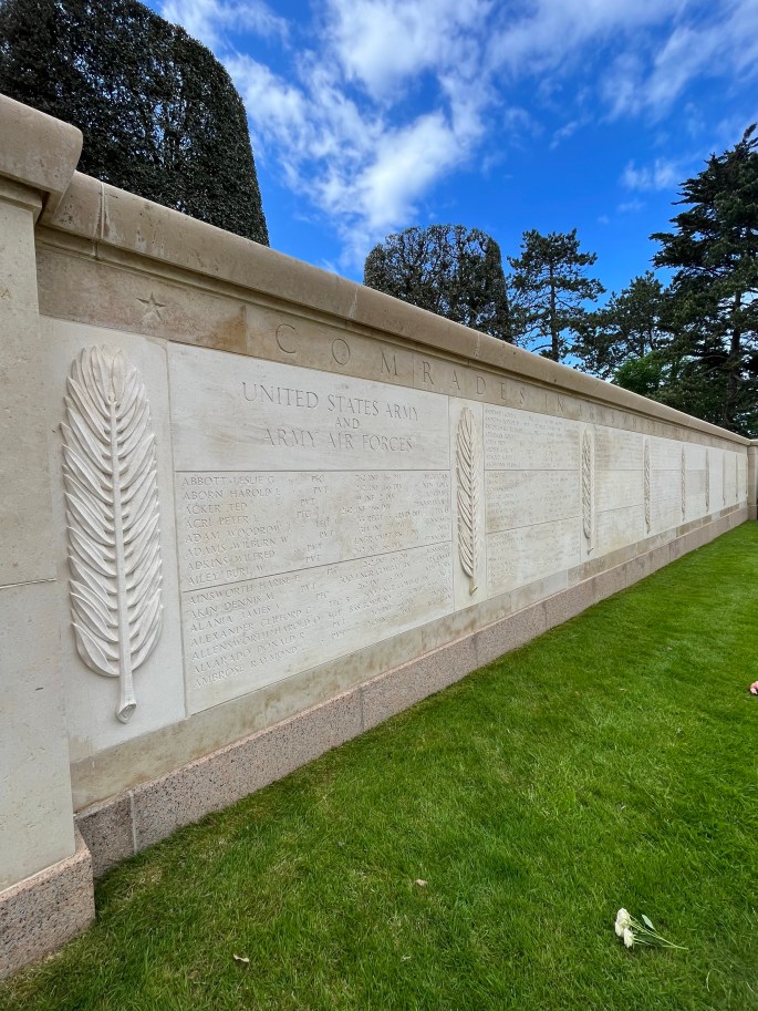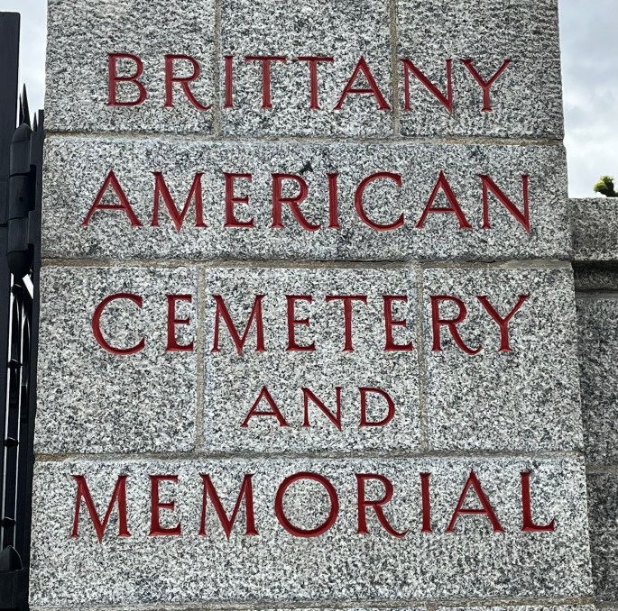 Like many other places, there was a peaceful reverence while we walked. I would guess that visitation is minimal as there is no public transportation to this location and a taxi would be needed after taking a train to Rennes. We saw one other couple during our time. Viewed from the air the cemetery forms the shoulder sleeve insignia of General Dwight D. Eisenhower’s Supreme Headquarters Allied Expeditionary Forces.