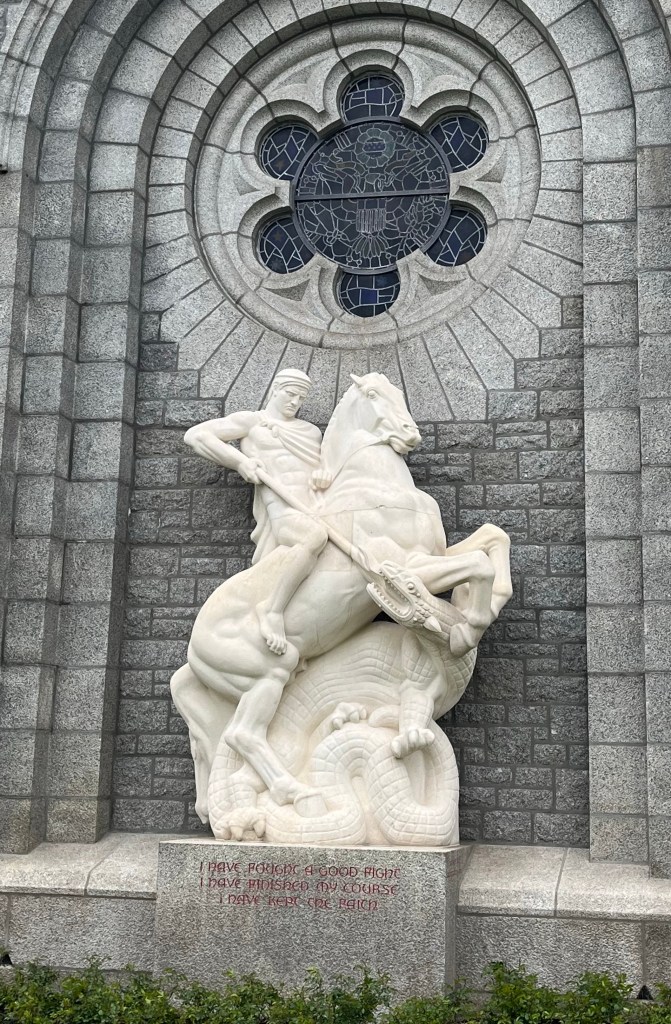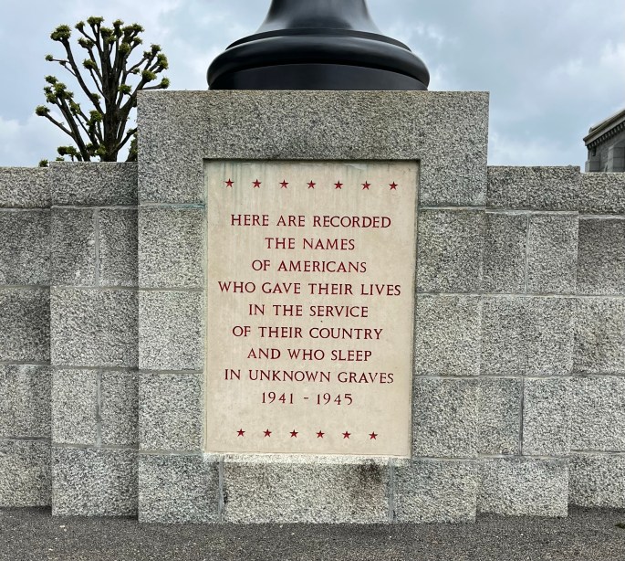 Behind this sculpture are tablets with the names of the missing in action, lost or buried at sea. 1557 names are listed along the panels. A few have a brown rosette next to a name on the wall to indicate they have been found.