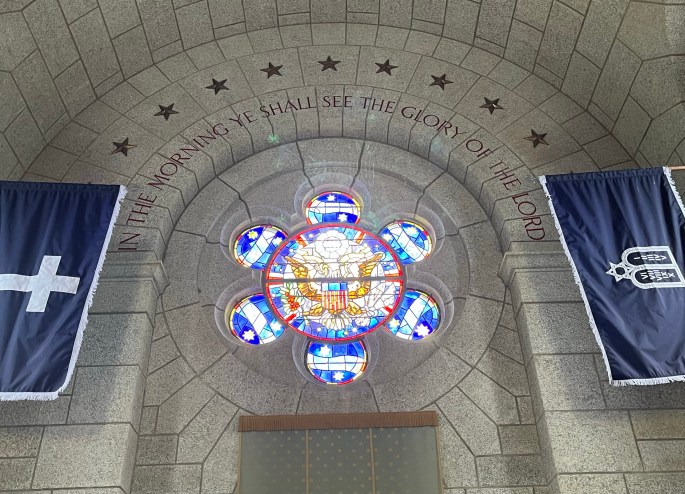 The chapel is built of granite typical of Brittany. Inside the memorial contains two large operations maps, and military corps flags hung from its walls. Eight stained glass windows depict some of the town liberated between Normandy and Paris.