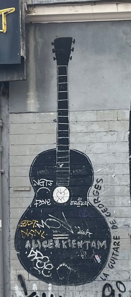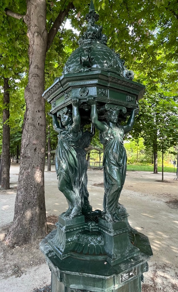 Walking through neighborhoods we discovered more of the green cast-iron water fountains donated by Englishman Sir Richard Wallace. He loved Paris and in 1872 used his own money to provide the people of Paris with drinking water. Hard to capture the water dripping from my photo – but it is there.