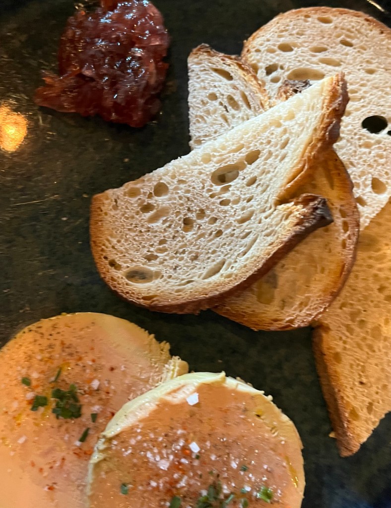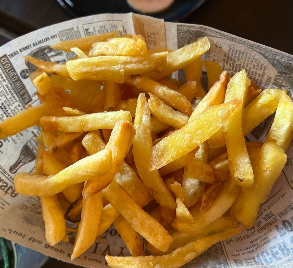 We had walked past this food stop several times, but one evening it was our destination. We had two appetizers – frites and foie gras. Most of my attention was directed towards the frites.