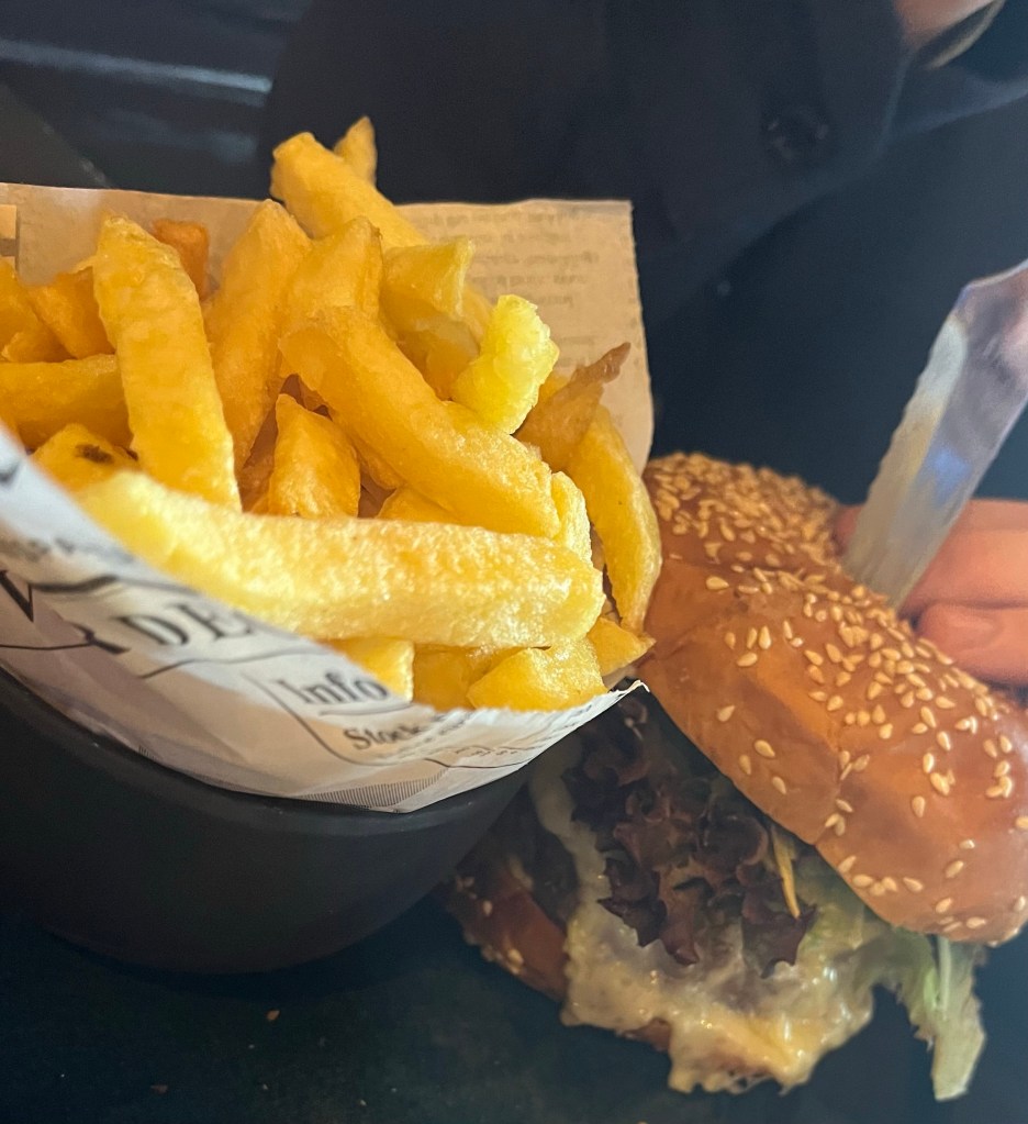 Our selections were varied: burger & frites (mine!)& vegetable lasagna.