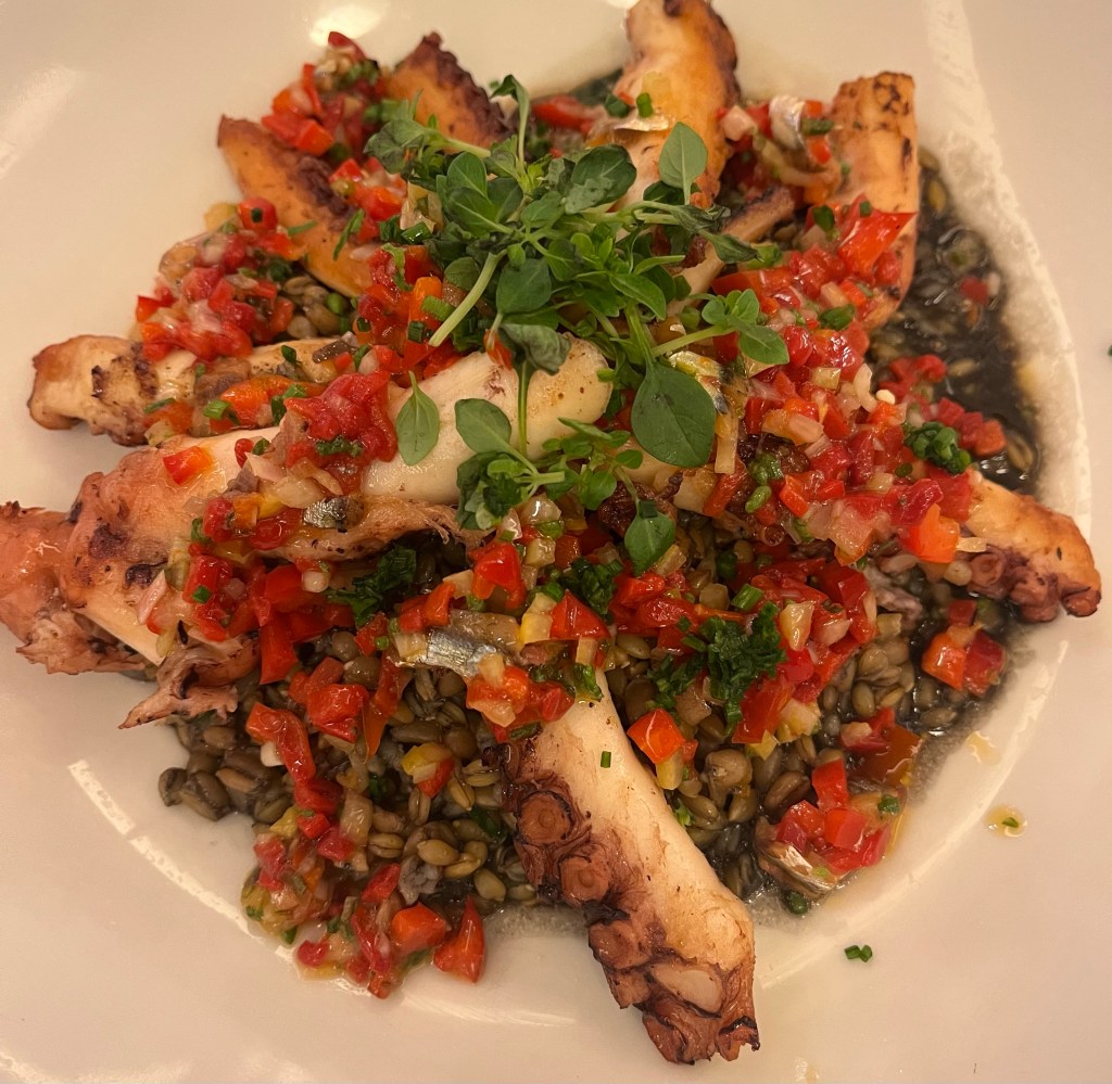 Lots of sharing plates in the beginning: No. 3 oysters, county pate’, eggs mayonnaise and grilled octopus a la plancha.
