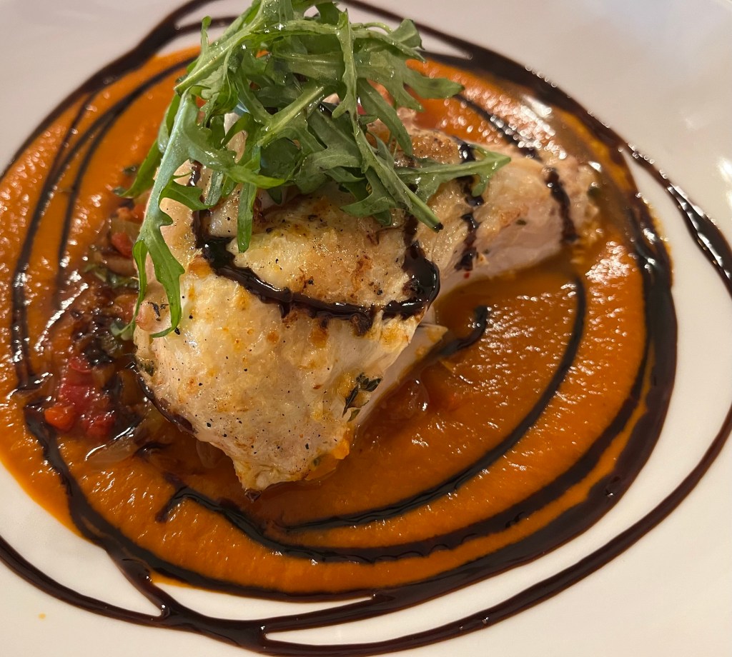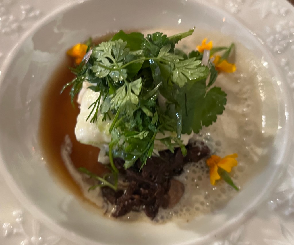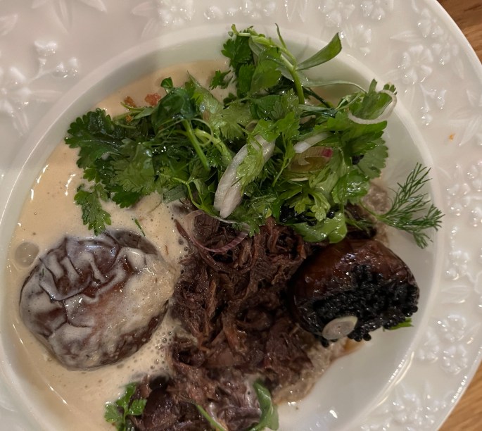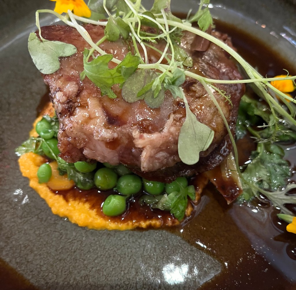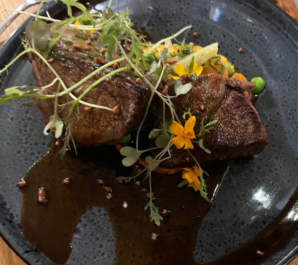 And then our entrees’ arrived – everyone was happy with their choices. OMG – my chicken (L) selection was fabulous. First the black plate arrived and I thought, huh, that’s it? When they continued to bring our dishes to the table, the white bowl to the right of the black plate appeared, which had the rest of my chicken – OMG, every piece was a detectible morsel. (R) braised Angus beef.