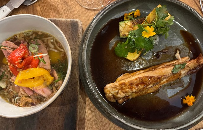 (L) veal sweetbread (R) smoked duck breast