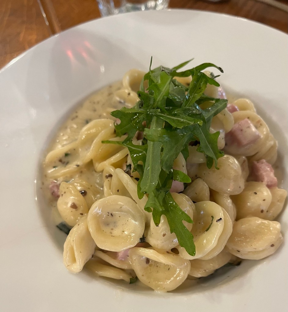 Entres’ were pasta w/bacon, chicken and beef w/frites.