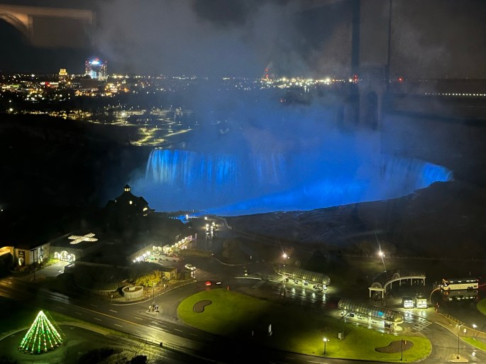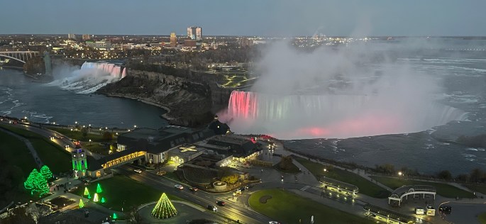 My first glimpse of Niagara Falls. It didn’t take long until they were lit up. The far left is the American Falls with the Canadian ‘horseshoe’ Falls closest to us.