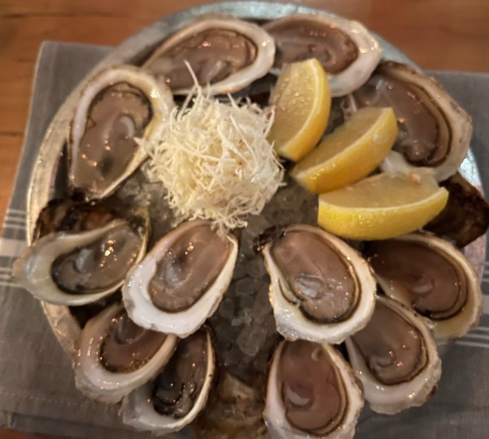 Before you know it we had another dozen oysters. He said ‘On the house’. He took an order for a dozen but mixed it up and duplicated our original oyster mix – which was not the ticket. And how many oysters did I eat???? Adrienne lost out. I had a dozen total – they were ‘Ginny-sized’. Small, tasty bivalves with a hint of Canadian salty brine.