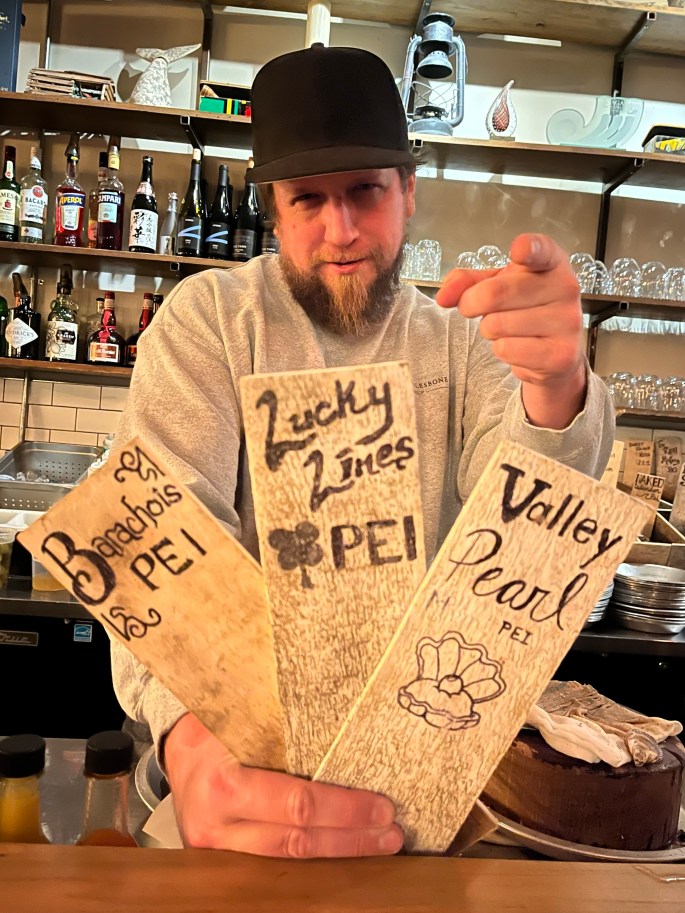 There were a variety of local types. We sat at the bar and the ‘shucker’ was quite a character. Duncan was his name. When asked what the types were on our plate, he pulled the signs out of the oyster bins and posed for my photo.