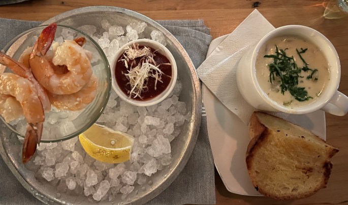 My shrimp were absoluteluy delicious – some of the best I’ve eaten at a restaurant. The clam chowder (not a typical choice for me) was also mighty tasty.