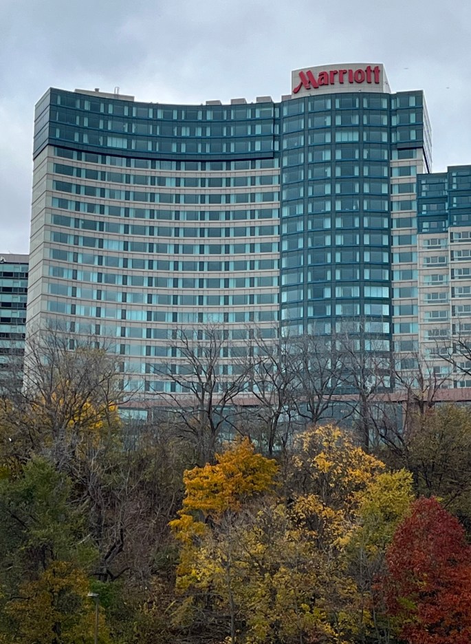 My travel agent – code for husband – booked us a room at the Mariott Fallsview Resort – excellent location and easy to find. As you can see below, we got to see a bit of the Fall color since a few trees had not dropped all of their leaves yet.