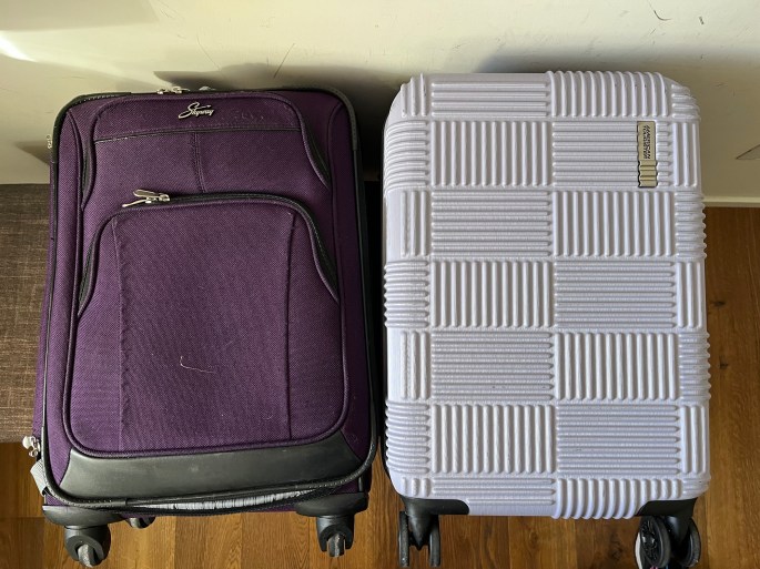 We have a soft-side suitcase and a hard-side suitcase. Why? ‘Soft’ to have some ‘give’ if you over-stuff or bring home too much. ‘Hard’ if you have something breakable, you’re bringing home. Pick them up when empty – ounces – there really are differences in weight. Inches – airlines are getting tighter with overhead bins and you want to know your bag will fit.
