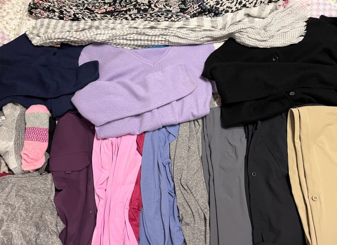 You need to lay out your clothes to see how many combinations can be worn. If something has only 1-2 combinations – rethink your selection. Here is my packing list for a chilly spring 2-week overseas trip.