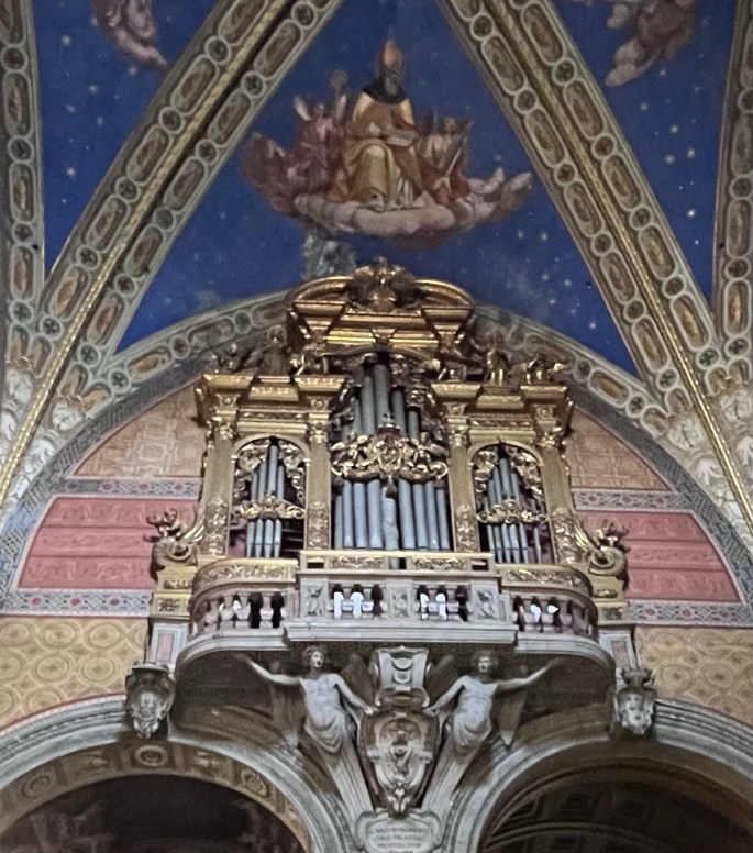 In 1628 two almost identical organs were placed above the choirs. The one in my photo was looted then set on fire. The other organ was removed and used in a basilica elsewhere in Italy. Eventually both organs were replaced in the 1900s.