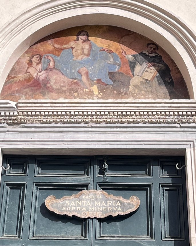 In the 8th century there was an oratory on this spot, but it wasn’t until the Dominicans took final possession of the property that a church was built in 1280. It was one of the very few examples of Gothic architecture in Rome. It was in the convent adjacent to this that in 1633 Galileo adjured his scientific thesis to save his life from the condemnation of the Holy Inquisition.