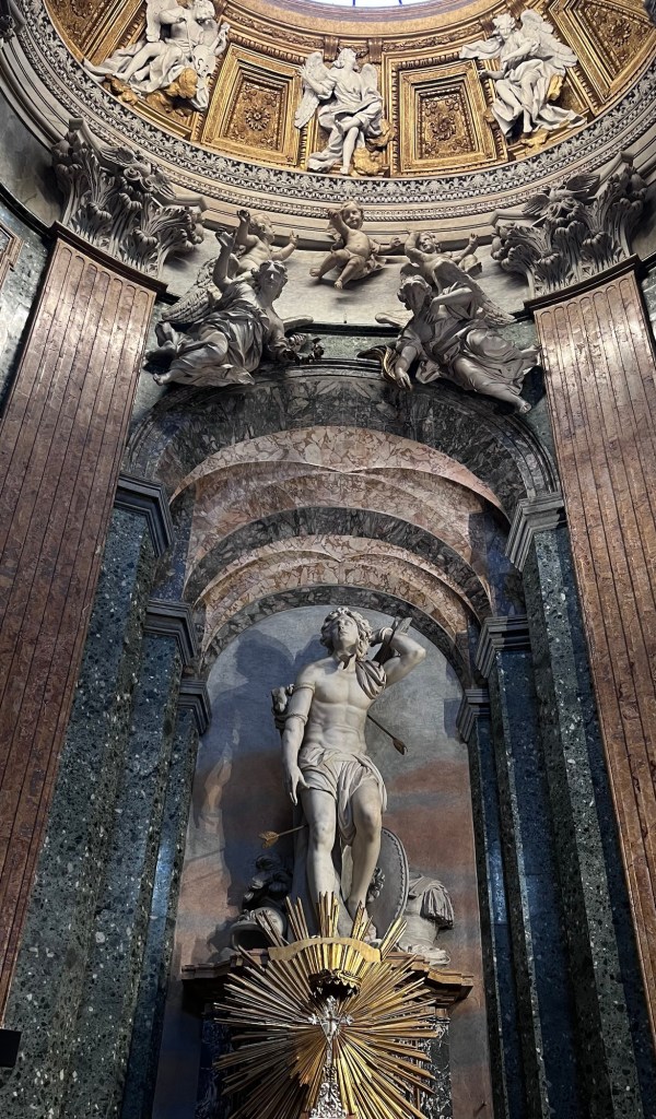 The inside of the church was surrounded by marble sculptural Baroque masterpieces, dedicated to individual martyred saints. Below was one of the seven immortalized in statue.