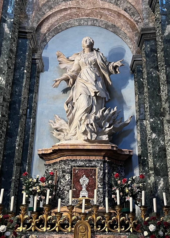 The alterpieces all take the form of bas-reliefs or statues rather than paintings. Below is the statue of St. Agnes when she extinguishes the flames at her feet with prayers.