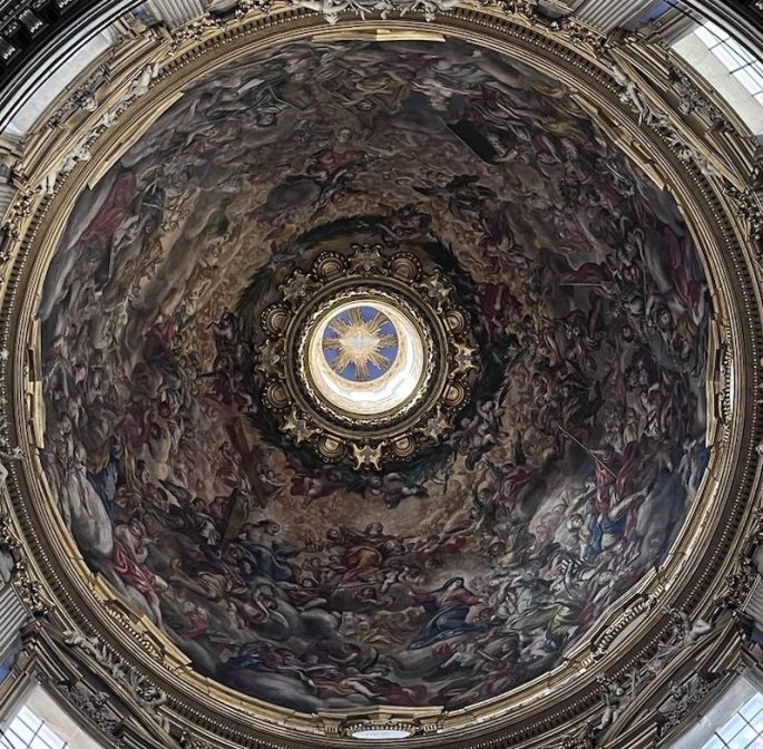 The dome was designed for individuals to look up to heaven. The fresco in the cupola depicts the Apotheosis of st. Agnes and the four cardinal virtues: prudence, justice, fortitude, and temperance. They form a virtue theory of ethics. All other virtues fall under them and hinge upon them.