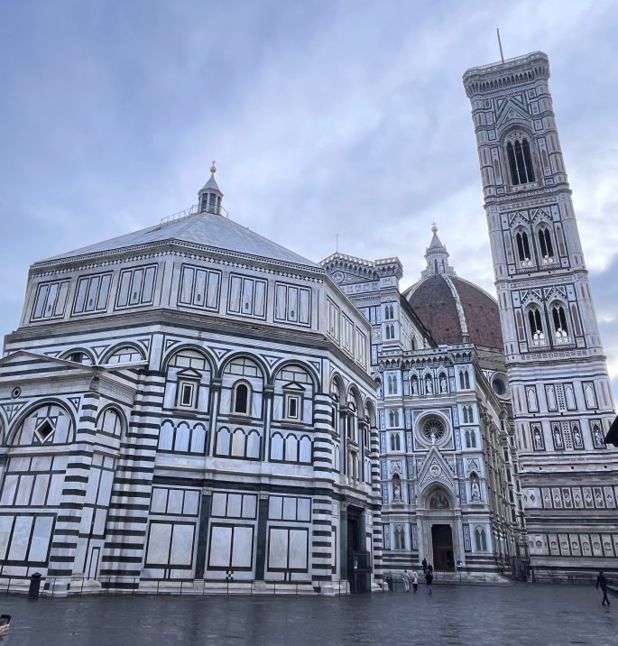 Formally called the Cathedrale di Santa Maria del Fiore, it is one of Italy’s largest churches. Gothic-style construction began in 1296 and was completed 1436. Here is a shot of the complex that hosts three buildings to include the church, the baptistry and the tower.
