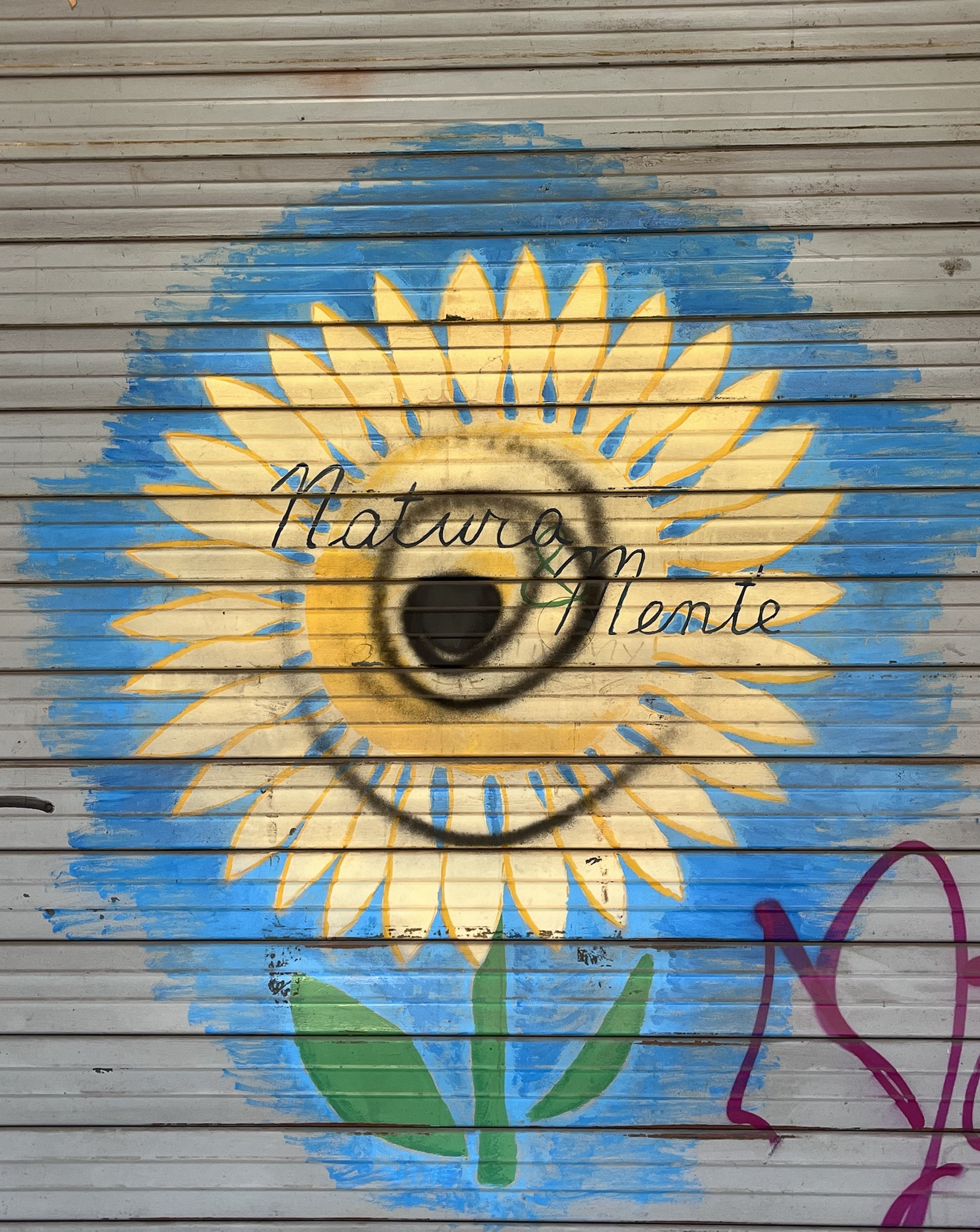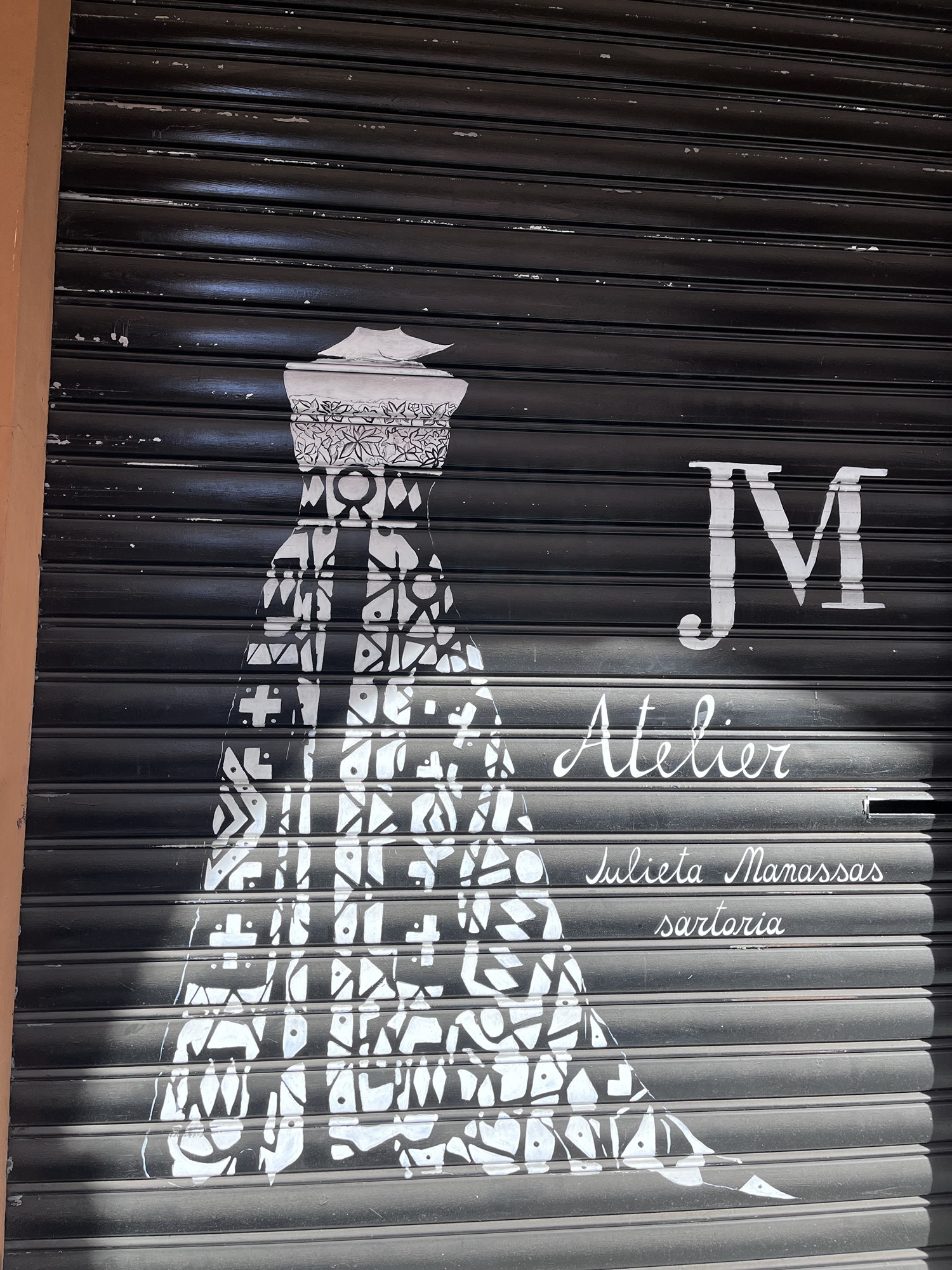 As we retraced our steps, a number of the shop fronts were not open but they chose an additional way to advertise their business on the metal grating covering their storefront. Cute.