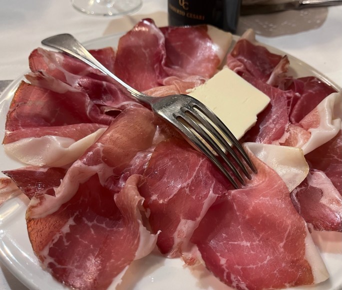 We had a delicious, d.e.l.i.c.i.o.u.s, absolutely tasty pork product, special to that region: Culatello di Zibello DOP with S. Ilario butter.