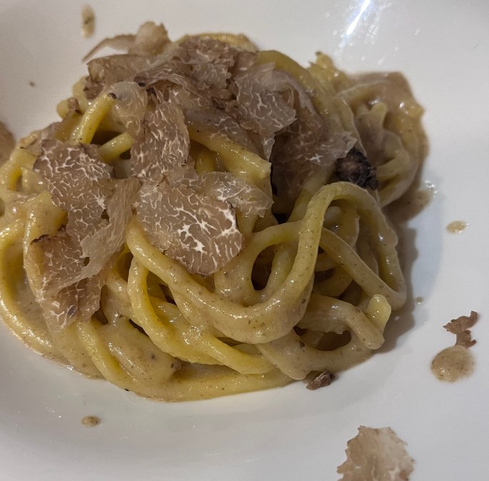 Eric had pasta with shaved fresh truffles – now he likes truffles – with home-made spaghetti.