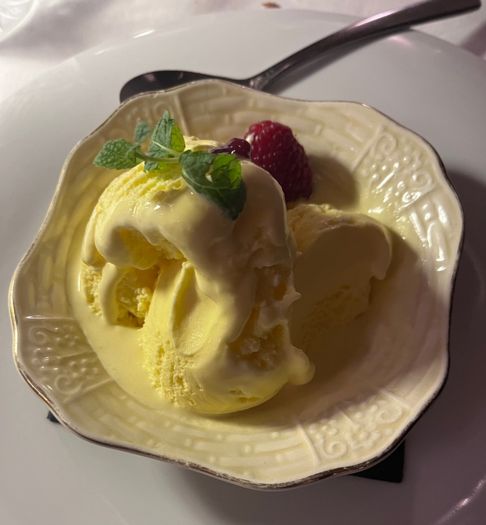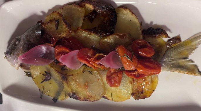 Eric was delighted with his whole fried seabass. It was brought to the table to ‘show’ him before she deboned it. It was lying on pan-fried potatoes – which were delicious.